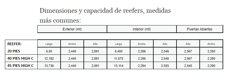 Finalmente existen medidas de reefers especiales, de 45, 48 y hasta 53 pies, con ancho especial wide pallet, los cuales son muy útiles en la optimización de costos logísticos, ya que permiten movilizar mayor capacidad de carga por unidad de transporte.